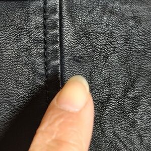 Punk rock, edgy black leather vest with bold studded details. Perfect for adding a rock-chic vibe to any outfit. Fair pre-owned condition with peeling of fabric around the collar and a tiny spot on the back of the vest. One of the screw-on metal studs is missing as well. Adds to the Punk rock asthetic.