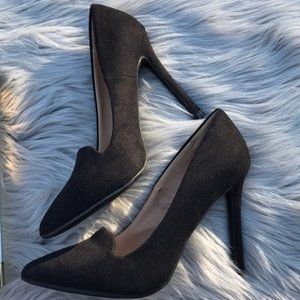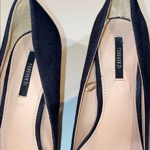 Forever 21 Black Suede Heels. Have a unique flat cut detail on topline of heel. Closed toe pump with pointed toe. Suede material. Approx 4" heel. Perfect and extremely comfortable for work and casual wear! Love them, but they just aren't my style anymore!