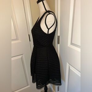 Chic black mini dress with textured design. Sleeveless with a flattering V-neck. Perfect for a night out.