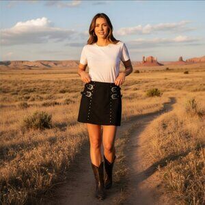 Style: Vegan suede mini skirt ✦ Western buckles ✦ rivet accents