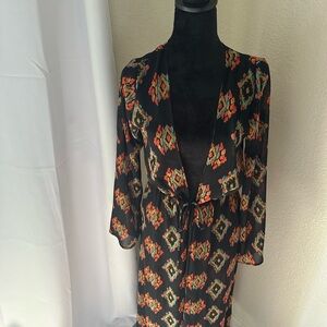 Stylish Forever 21 dress with vibrant geometric patterns. Features long sleeves and a tie waist. Perfect for casual outings.
