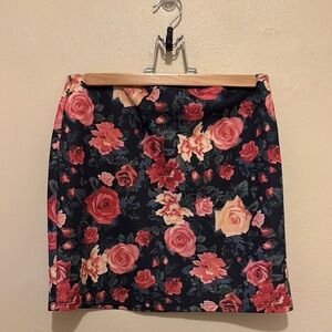This chic mini pencil skirt from Forever 21 features a striking black base adorned with vibrant pink roses, perfect for a casual night out. Its fitted design and stretchy material ensure a flattering silhouette, making it a stylish addition to any wardrobe.