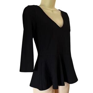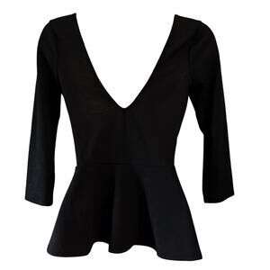 Black on black semi sheer lace print knit top with v-neckline front and back, 3/4 sleeves and peplum styling