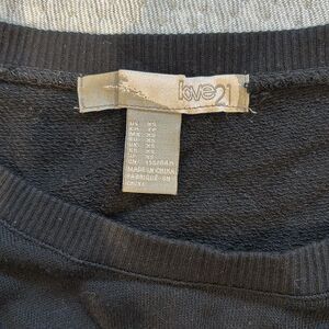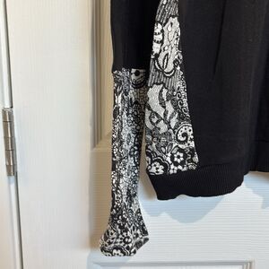 Black sweater. Has a floral lace like pattern/print on the ends of the sleeves and a little on the sides. Back is plain black