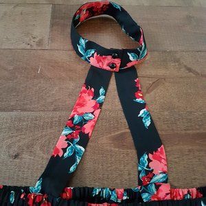 Black with Red Floral Print Off-Shoulder Top with Neck Strap
