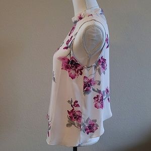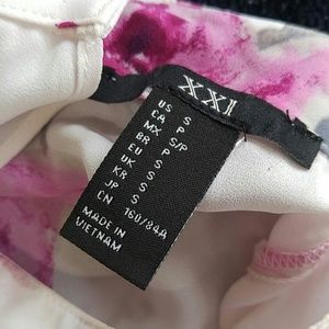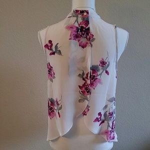 This blouse is beautiful. Open in the back. It buttons at the back of the neck. I wore this one time. It is in excellent condition. Sheer. Size S. From pit to pit it measures 18". Purple, mauve, navy blue and gray all on an ivory background.