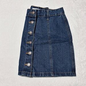 Stylish blue denim skirt. Features button-down front. Perfect for casual wear.