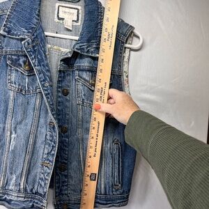 Chic sleeveless denim vest. Button-up front. Perfect for layering.