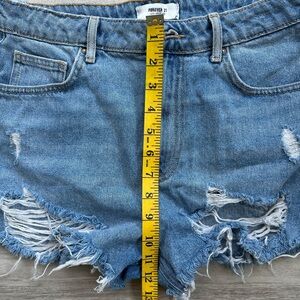 These high-waisted jean shorts from Forever 21 feature a striking blue hue with heavy distressing for a trendy, worn-in look. The raw, frayed hem and loose fit through the leg add to their casual appeal, making them a perfect choice for laid-back outings.