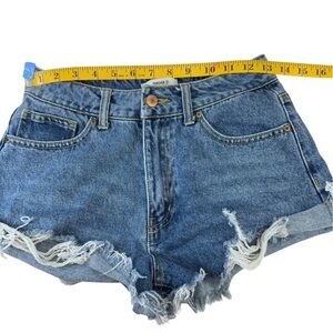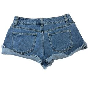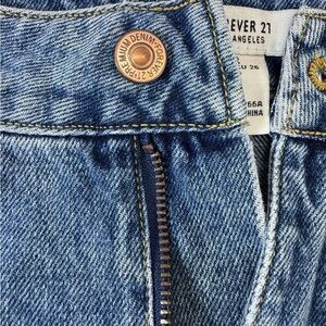 These Forever 21 jean shorts boast a classic medium blue hue and a high-waisted design, perfect for a trendy look. The distressed detailing and frayed hem add a touch of vintage charm, making them a stylish choice for casual outings.