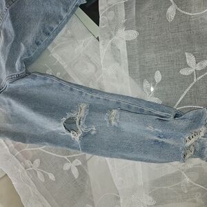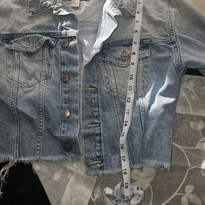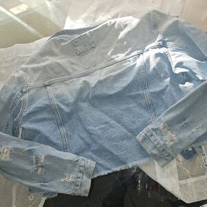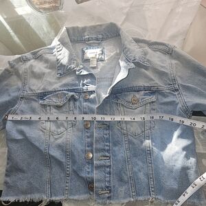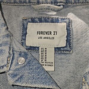 This Forever 21 blue jean jacket features a classic design with a light denim color and a relaxed fit. The jacket is perfect for layering and adds a stylish touch to any casual outfit.