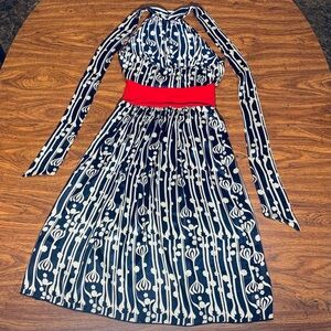 This stunning Forever 21 maxi sundress features a beautiful dark blue background adorned with wavy gold design, creating a dynamic look. The dress is designed sleeveless and a flattering halter neckline, making it perfect for a cocktail occasion. Great condition. No flaws.