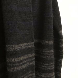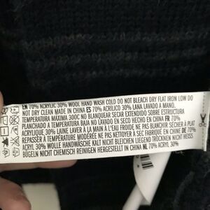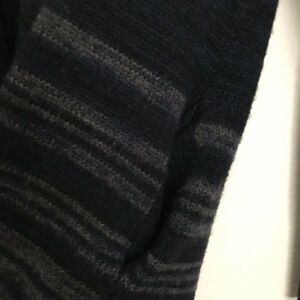 Women’s oversized cardigan sweater by Forever 21. This blue cardigan is open front with a cowl neck and stripes on the bottom half. It is a heavyweight wool and acrylic blend.