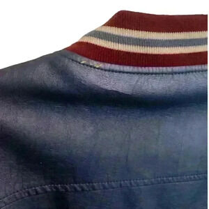 Gently used shiny blue bomber jacket with red and white sleeves. Note - a tiny bit of flaking in the back but not very noticeable see photos. Price reflects this.