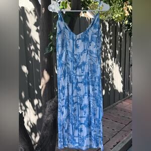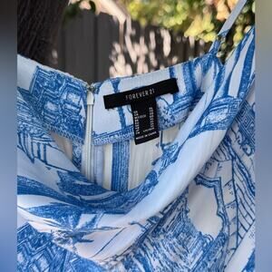 Chic and breezy, this Forever 21 slip dress features a stunning blue and white toile-inspired print with palm trees, parrots, and Roman architecture motifs. Designed with a flattering cowl neckline, adjustable spaghetti straps, and a midi length, this dress is perfect for summer outings, vacations, or layering with a light jacket. Hidden back zipper for easy wear. Excellent condition.