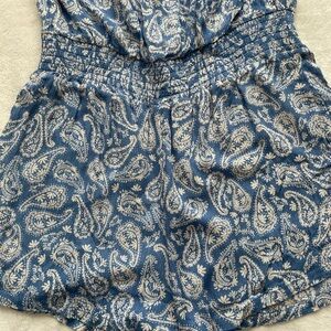 Chic strapless romper with a blue and white paisley design. Ideal for casual wear. Worn a few times but in good condition no stains or rips. Some pilling from wear