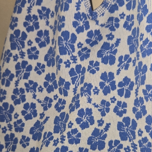 This stylish tank top from Forever 21 features a vibrant blue and white floral pattern, perfect for a summery look. The sleeveless design and open back add a touch of elegance, making it ideal for warm weather outings. Its crop style ensures a trendy and comfortable fit.