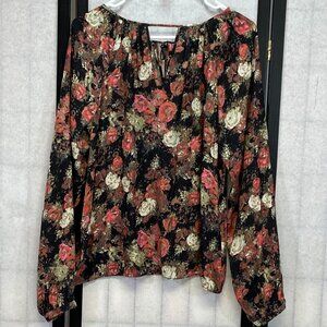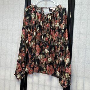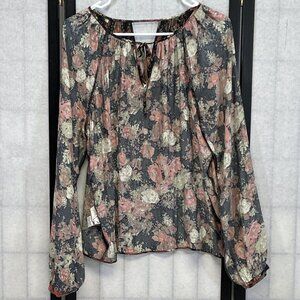 Forever 21 Boho Floral Peasant Blouse Long Raglan Sleeve Tie V-Neck Top Black L