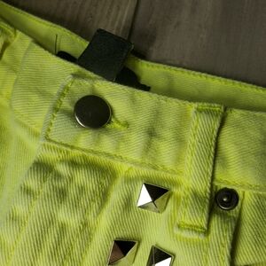 These vibrant yellow jean shorts feature edgy silver studs for a bold, rebellious look. Made from durable denim, they have a raw hem for a casual, laid-back style. Perfect for making a statement on any casual outing.