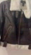 Stylish brown leather jacket featuring white fur trim. Perfect for a chic look. Faux leather! This is not authentic leather