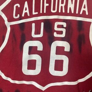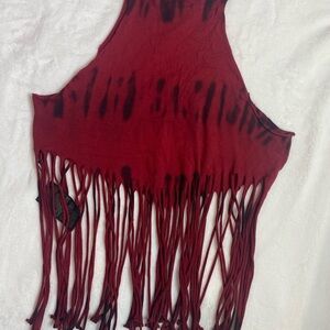 Stylish burgundy crop top with fringe. Features bold California US 66 print.