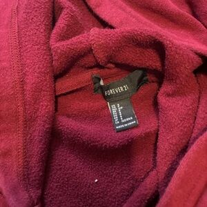 Chic burgundy varsity jacket with hood. Features button closure and striped hem. Ideal for casual wear.