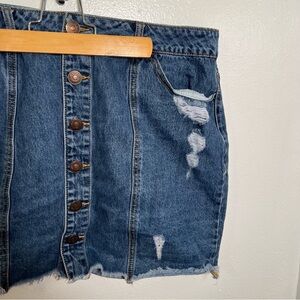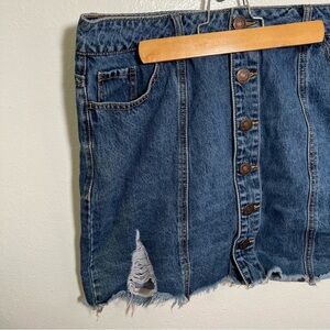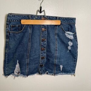 Great condition, minor wear. Forever 21+. Button front denim cut off skirt. Medium wash. Distressed. Plus size 0X. 100% cotton. Waist 16” Waist to hem 16”. All measurements are approximate and taken lying flat. Smoke free home. No trades, offers welcome.