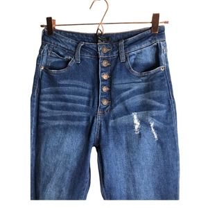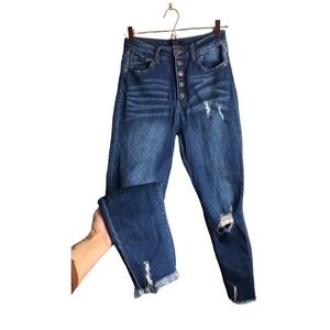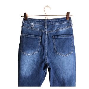 Great used condition little hole on belt loop price reflects below for great discounts and I ship same day! Button fly high waisted denim with stretch multiple pockets whole distressed raw hem jeans