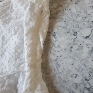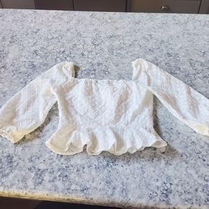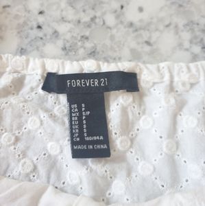 White Forever 21 button up ruffle top with 1/2 lightly flared sleeves! Super cute breathable top featuring an adorable button up front with concealed zipper on the left side and a light crop and squared neckline. Size small, modeled on a S