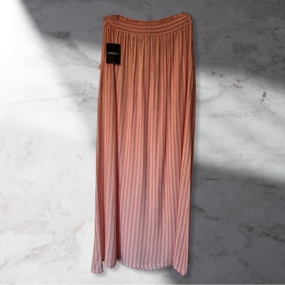 New, never worn Forever 21 striped maxi skirt. Button front. Bow detail at waistband. Elastic at rear waistband. Functional pockets. Very lightweight linen blend. Material is a little on the thinner side, nothing a pair of biker shorts underneath couldn’t fix, or would be great as a beach/pool coverup skirt.