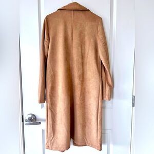 This Forever 21 trench coat in a warm tan hue offers a timeless and sophisticated look. Crafted with a tailored silhouette, it provides both style and comfort for cooler days. Its classic design makes it a versatile addition to any wardrobe. Tags removed, never worn.