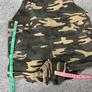 FOREVER 21 CAMO DENIM OVERALLS WOMENS 27 CUFFED POCKETS STRETCH COTTON SHORTALLS