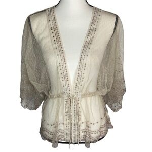 Forever 21 Cardigan Cream Mesh Lace Taupe Embroidered Short Kimono Style Sleeve