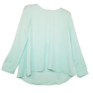 Forever 21 Career Casual Women's Teal Pullover Long Sleeve Size-(Tag Removed See Measurements) Material - 100% Polyester, Care - Machine Wash Cold, Tumble Dry Low, Made in China; Color Teal, Pull on Blouse, Round Neck with Keyhole Under one Button Back Center Neckline, Long Cuffed Button Sleeves Rouching at Cuff, Hi-Low Hem,