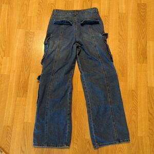 The product is a pair of Forever 21 Cargo Utility Jeans in a wide leg, baggy style with a mid-rise fit. These blue jeans feature a zip and button closure, denim fabric, and accentuated with a buckle. They are designed for women in a size 25 with an inseam of 26.5 inches.