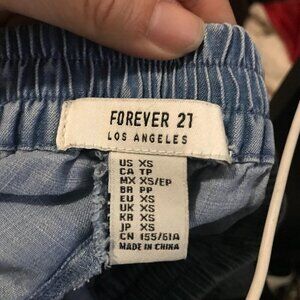 Forever 21 chambray boho embroidered shorts and off the shoulder tank top set. The top is a size small and the shorts are a size XS. The shorts fit like a standard small and have a 26" elastic waistband. Washed and worn a few times but still in very good condition. No flaws at all.