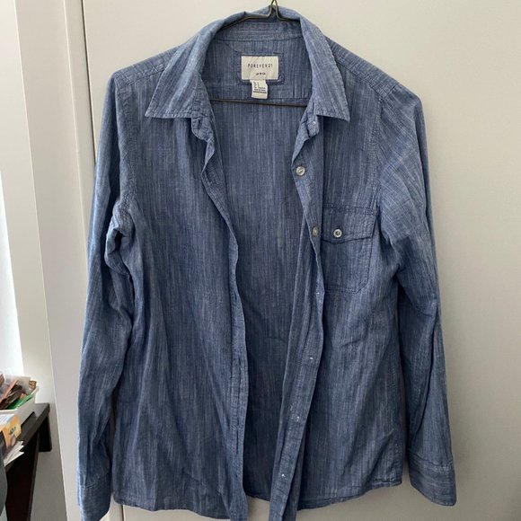 Chambray/light blue thin button up blouse from Forever 21, size S