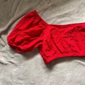 Brand new never worn. Super cropped, eyelet lineny fabric. Poof sleeves that go off the shoulder.