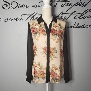 Forever 21 Chiffon Floral Button Up Top with Black Long Sleeve, S