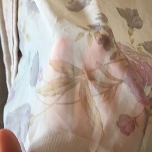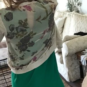 Tan cotton sleeves and front and entire back is sheer floral chiffon.