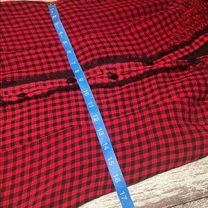 Featuring a bold red and black checkered print, soft sheer side panels, and ruffled lace trim along the button front, this top mixes classic flannel vibes with feminine flair.