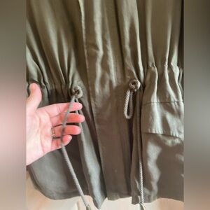 This fun army green jacket has grey sweater sleeves. Mock neck, zip and snap closure. Adjustable ties cinch the waist. Chest zipper pockets and lower side pockets with snaps.