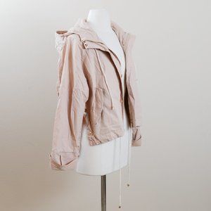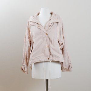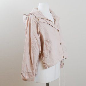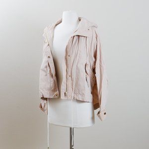 This cute neutral colored jacket has a modern vibe. The fit is a bit boxy and cropped. It's an XS, but can also fit a size small. No flaws to mention. Thanks for looking! Material is Cotton and Polyester, Machine Wash Cold.