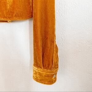 Forever 21 Contemporary mustard velour button front crop top. Buttoned cuffs. Pockets at the chest. Collared. Color changes a bit with light shift ranging from yellow to orange.
