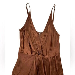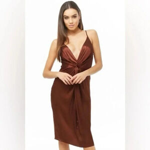 Brown satin midi dress with twist-front detail from Forever 21 Contemporary. Adjustable spaghetti straps, concealed zipper closure, and slit at the back of the skirt.