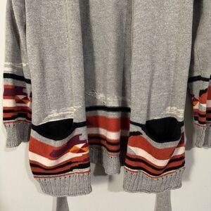 2010s knit cotton/nylon/wool open belted cardigan with pockets featuring a southwestern Aztec inspired geometric pattern.