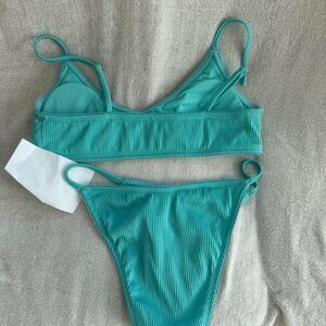 turquoise, bow accents, girly bikini, summer set, cute swimwear, ruffled top, scalloped edges, playful style, feminine swim, vacation ready