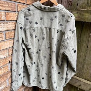 Olive button down shirt with black geometric patterns. Features a chest pocket and button cuffs.