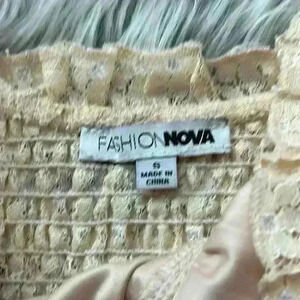 Enchanting puff sleeve top lace up front top from Fashion Nova. This size Small gem has only been worn once, no signs of wear and in perfect condition. This top is a delightful blend of floral elegance and subtle sparkle. The intricate design, adorned with pearls, creates a whimsical allure, while flattering ruffles ensure a gracefully flowing silhouette.