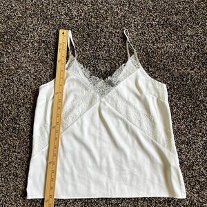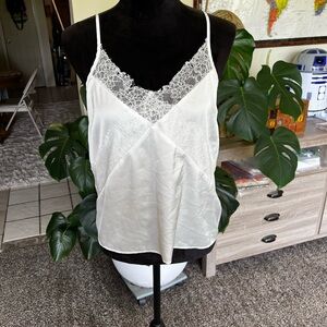 This Forever 21 camisole top in a soft cream hue features a plunging V-neckline adorned with intricate lace detailing.Please see all pictures top of lace is not perfect. The delicate lace trim and thin straps add a romantic touch, while the lightweight fabric ensures a comfortable fit. 100% polyester